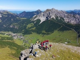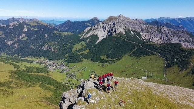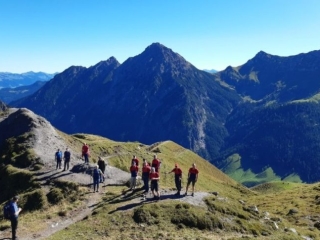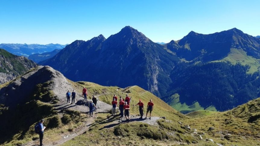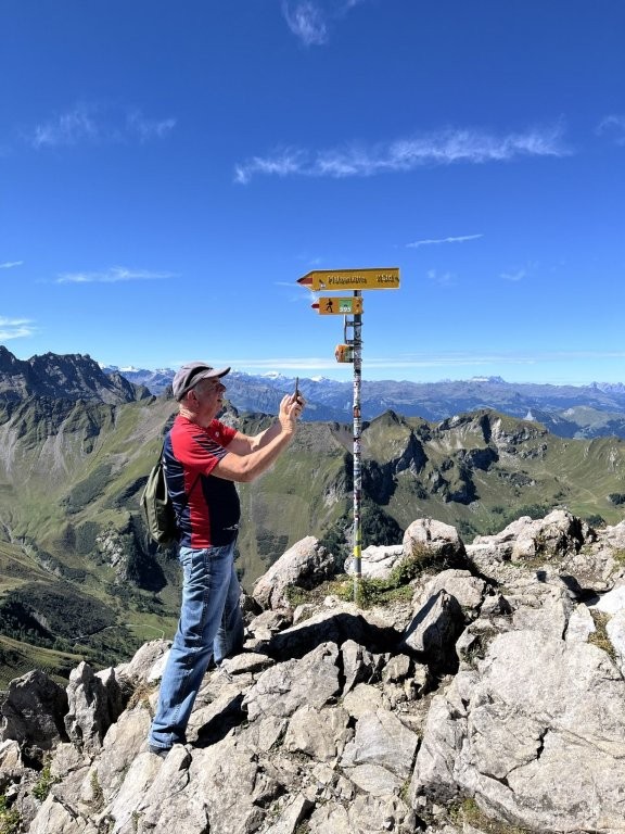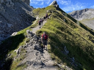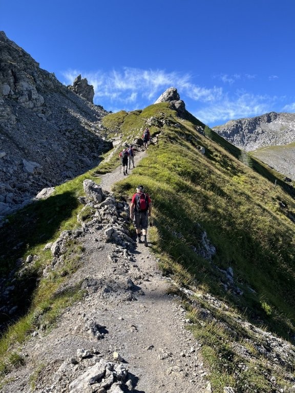 Auf dem Gratweg ging es zum Sareiserjoch und dann auf schmalen Pfaden zwischen Alpenblumen und Felsen bergauf zum höchsten Punkt der Wanderung, dem Augstenberg 2359 Meter über Meer. Bei Traumwetter konnten wir eine eindrucksvolle Aussicht geniessen.