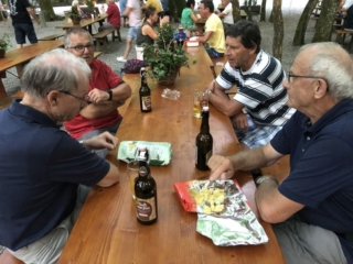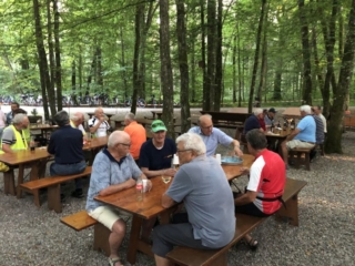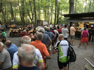 Über Almensberg – Muolen – Balgen, vorbei am herrlichen Balgerweier – weiter über Winden – Betenwil – Burkartshaus – Stockershaus – Gaishäusern – Hungerbühl – Spitz trafen wir nach einer guten Stunde Fahrzeit in der Waldschenke Romanshorn ein, wo wir durch etliche Mitveteranen begrüsst wurden. Die lange Warteschlange vor der Schenke zeigte uns, dass dieser „Geheimtipp“ nicht mehr so geheim ist, wie der Name es vermuten liesse. Nach längerer Wartezeit, was jedoch der Stimmung keinen Abbruch leisten konnte, durften wir dann unseren Durst löschen und den Gluscht nach etwas Essbarem stillen. So verging die Zeit bei tollen Gesprächen, herrlicher Atmosphäre und angenehmer Temperatur wie im Fluge.